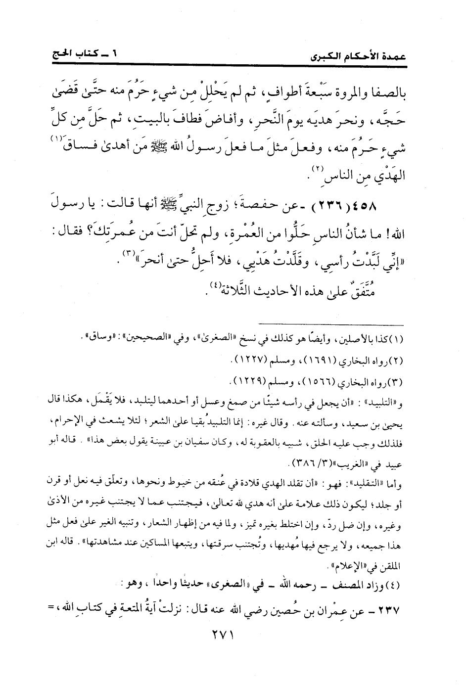 458 (236) - عن حفصةَ؛ زوجِ النبيِّ - صلى الله عليه وسلم - أنها قالت: يا رسولَ الله! ما شأنُ الناسِ حَلُّوا من العُمْرةِ، ولم تحلّ أنتَ من عُمرَتِكَ؟ فقال: "إنِّي لَبَّدْتُ رأسِي، وقَلَّدْتُ هَدْيِي، فلا أَحِلُّ حتى أنحرَ" (¬3).