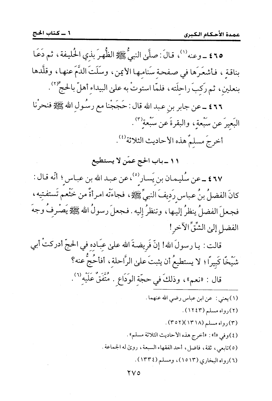 466 - عن جابر بنِ عبد الله قال: حَجَجْنا مع رسُولِ الله - صلى الله عليه وسلم - فنحرْنا البَعِيرَ عن سَبْعةٍ، والبقرةَ عن سَبْعةٍ (¬3).