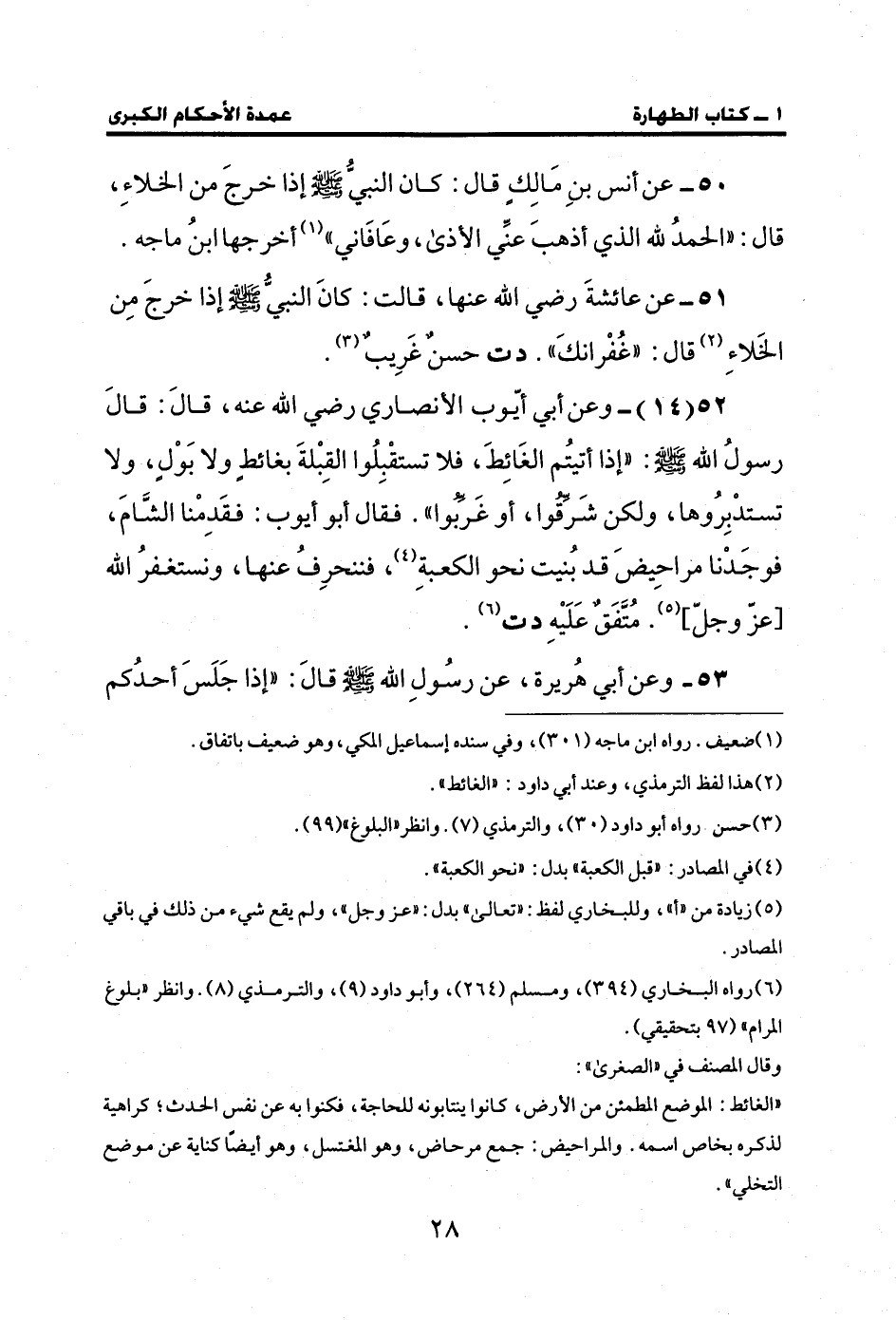51 - عن عائشةَ رضي الله عنها، قالت: كانَ النبيُّ - صلى الله عليه وسلم - إذا خرجَ مِن الخَلاءِ (¬2) قال: "غُفْرانكَ". د ت حسنٌ غَرِيبٌ (¬3).