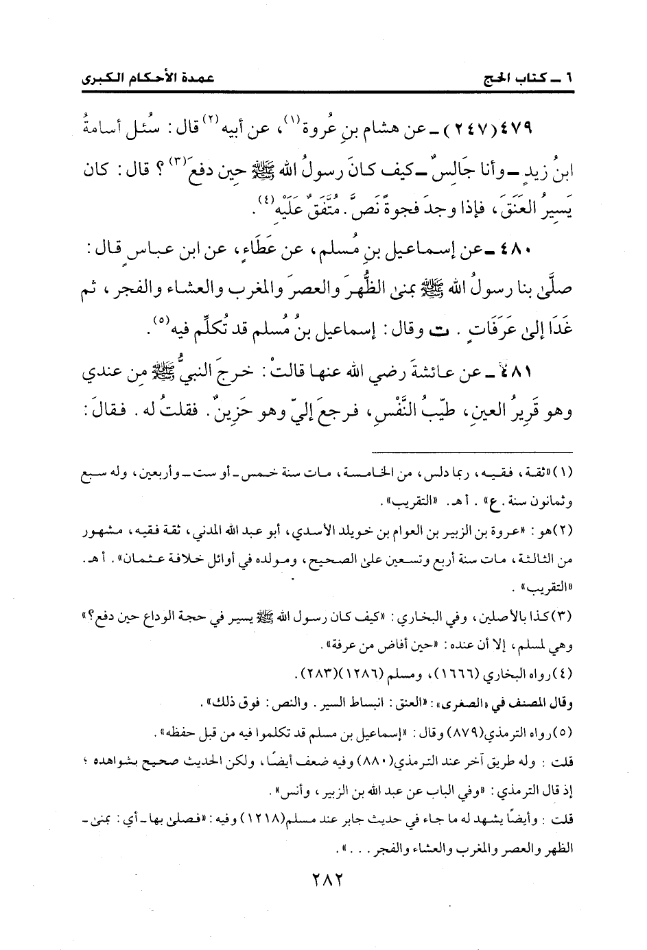 479 (247) - عن هشام بنِ عُروة (¬1)، عن أبيه (¬2) قال: سُئل أسامةُ ابنُ زيدٍ - وأنا جَالِسٌ - كيف كانَ رسولُ الله - صلى الله عليه وسلم - حِين دفعَ (¬3)؟ قال: كان يَسِيرُ العَنَقَ، فإذا وجدَ فجوةً نَصَّ. مُتَفَقٌ عَلَيْهِ (¬4).