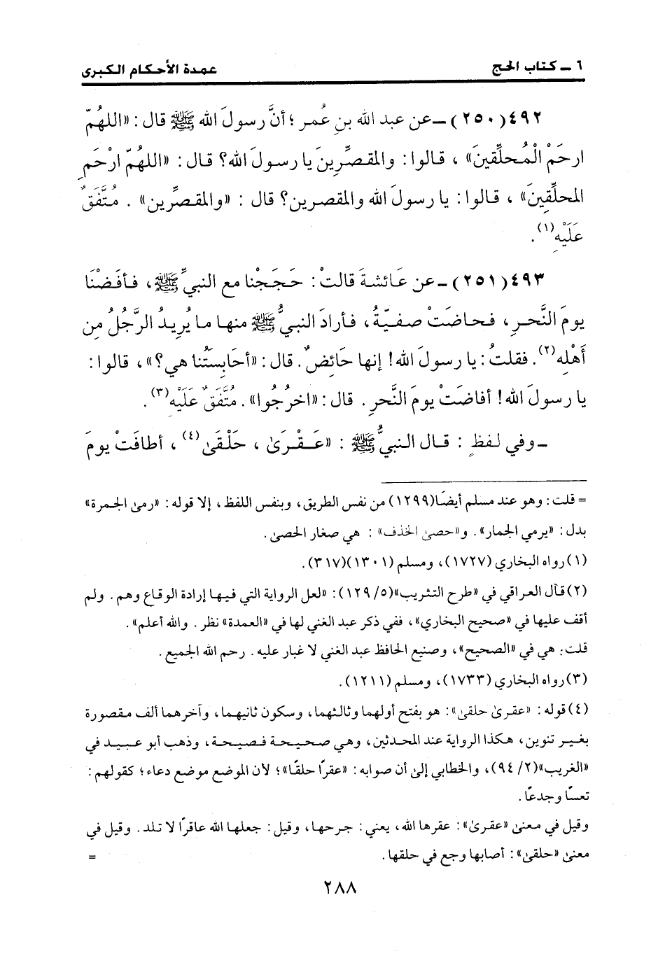 492 (250) - عن عبد الله بن عمر؛ أنَّ رسولَ الله - صلى الله عليه وسلم - قال: "اللهُمّ ارحَمْ الْمُحلِّقينَ"، قالوا: والمقصِّرِينَ يا رسولَ الله؛ قال: "اللهُمّ ارْحَمِ المحلِّقِينَ"، قالوا: يا رسولَ الله والمقصرين؟ قال: "والمقصِّرين". متَفَقٌ عَلَيْهِ (¬1).