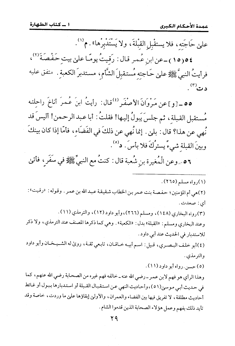 54 (15) - عن ابنِ عُمر قال: رَقِيتُ يومًا على بيتِ حَفْصَةَ (¬2)، فرأيتُ النبيَّ - صلى الله عليه وسلم - على حَاجتِهِ مُستقبِلَ الشَّأمِ، مستدبرَ الكعبةِ. متفق عليه د ت (¬3).