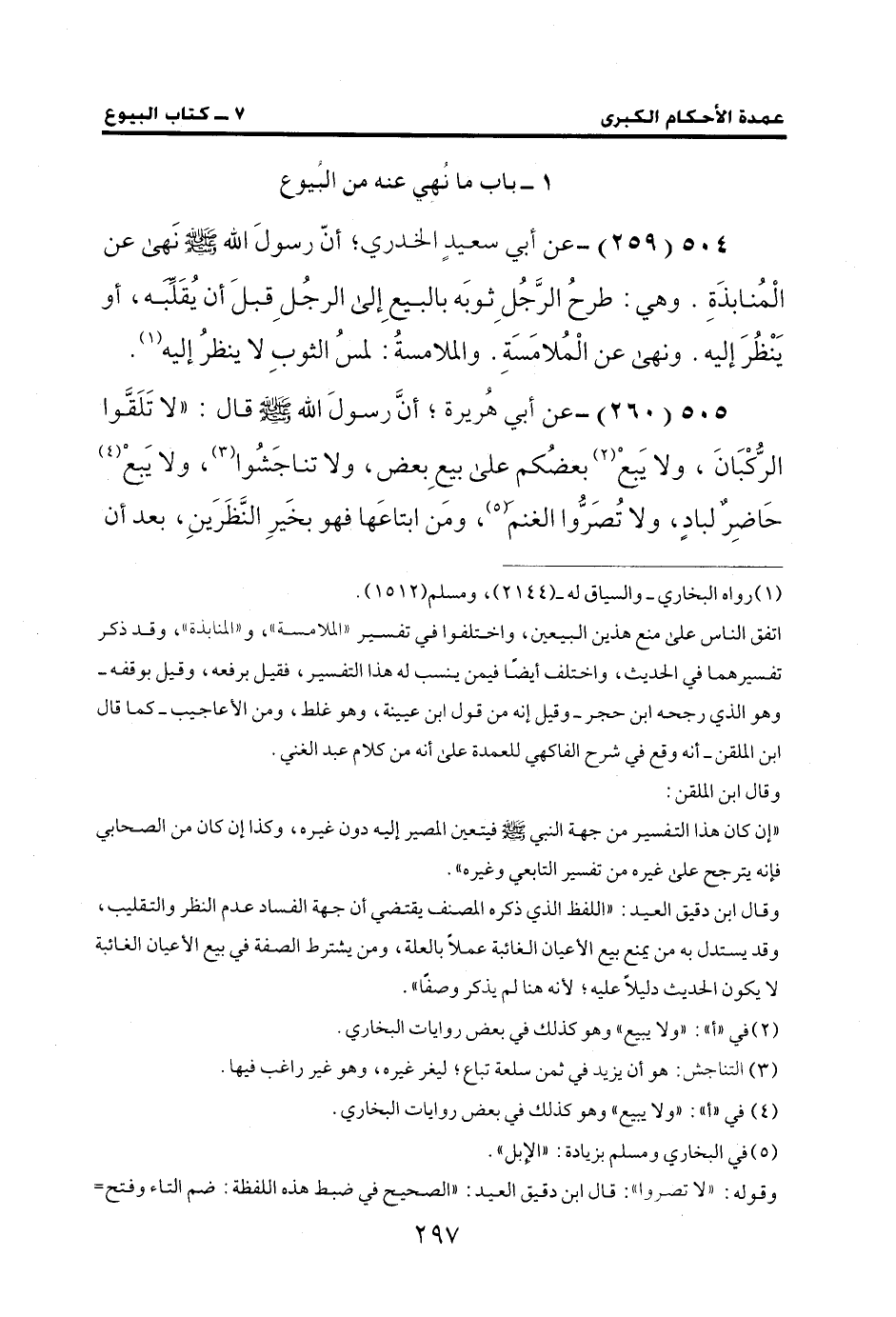 اتفق الناس علي منع هذين البيعين، واختلفوا في تفسير "الملامسة"، و"المنابذة"، وقد ذكر تفسيرهما في الحديث، واختلف أيضًا فيمن ينسب له هذا التفسير، فقيل برفعه، وقيل بوقفه- وهو الذي رجحه ابن حجر- وقيل إنه من قول ابن عيينة، وهو غلط، ومن الأعاجيب -كما قال ابن الملقن- أنه وقع في شرح الفاكهي للعمدة علي أنه من كلام عبد الغني.