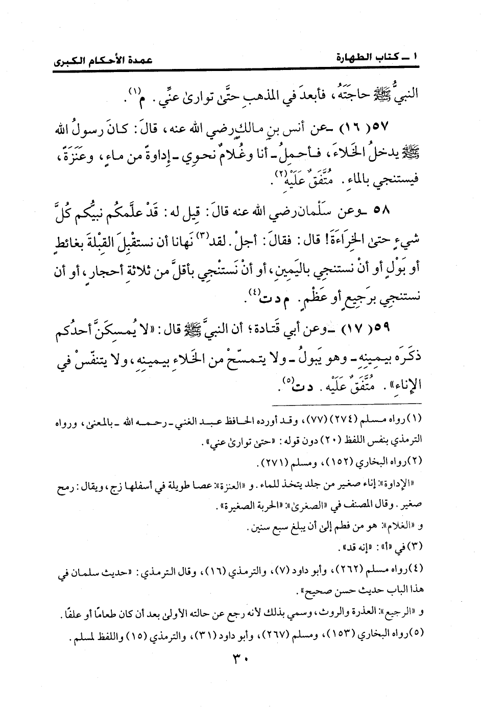 57 (16) - عن أنس بن مالكٍ رضي الله عنه، قالَ: كانَ رسولُ الله - صلى الله عليه وسلم - يدخلُ الخَلاءَ، فأحمِلُ -أنا وغُلامٌ نحوِي- إِداوةً من ماءٍ، وعَنَزَةً، فيستنجي بالماءِ. متَّفَقٌ عَلَيْهِ (¬2).