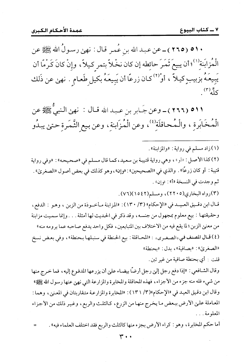 511 (266) - وعن جَابر بن عبد الله قال: نهى النبيُّ - صلى الله عليه وسلم - عن الْمُخَابَرةِ، والْمُحاقلَةِ (¬4)، وعن الْمُزَابنةِ، وعن بيعِ الثَمَرةِ حتى يبدُو