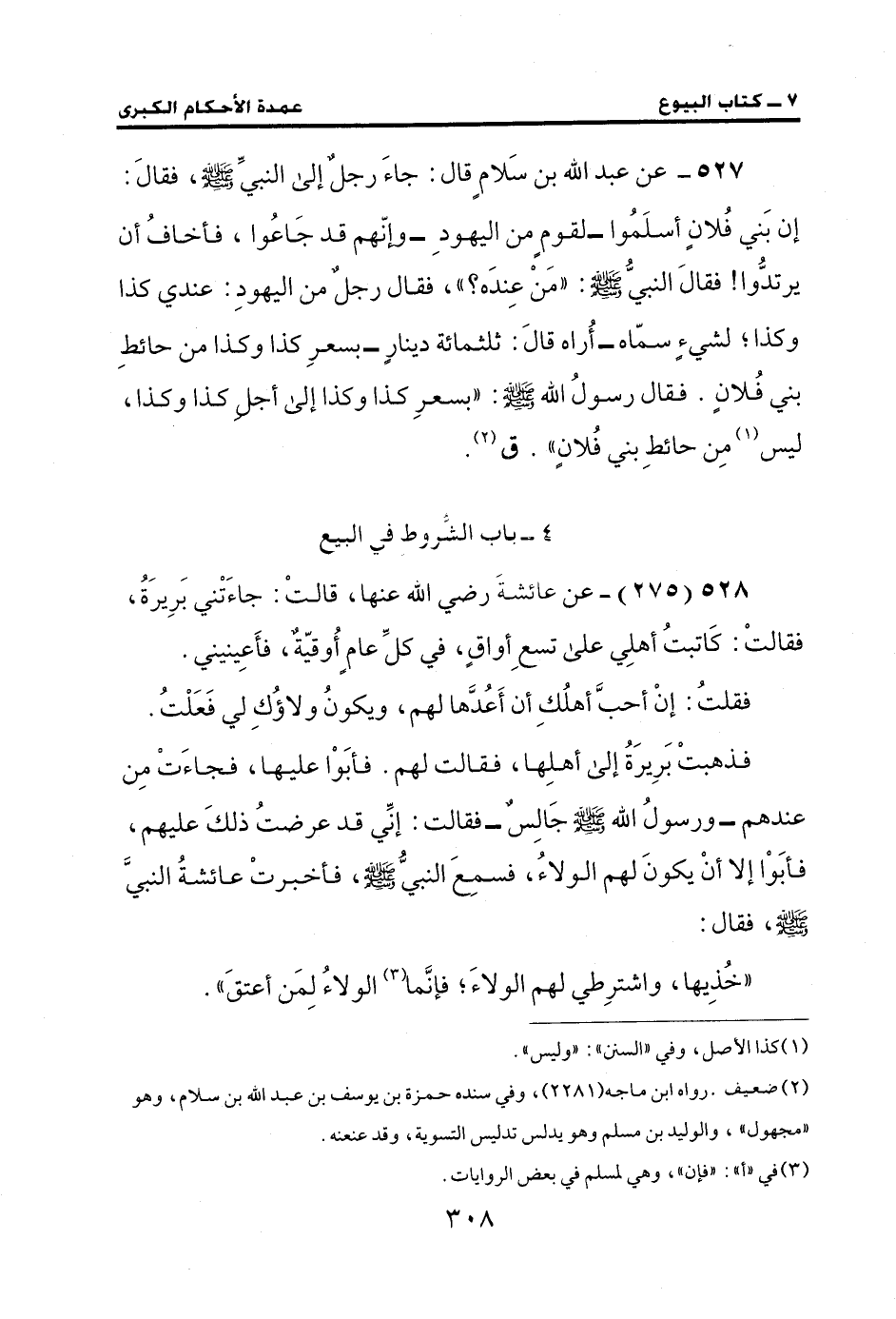 527 - عن عبد الله بن سَلامٍ قال: جاءَ رجلٌ إلى النبيِّ - صلى الله عليه وسلم -، فقالَ: إن بَني فُلانٍ أسلَمُوا - لقومٍ من اليهودِ - وإنّهم قد جَاعُوا، فأخافُ أن يرتدُّوا! فقالَ النبيُّ - صلى الله عليه وسلم -: "مَنْ عِندَه؟ "، فقال رجلٌ من اليهودِ: عندي كذا وكذا؛ لشيءٍ سمّاه - أُراه قالَ: ثلثمائة دينارٍ - بسعرِ كذا وكذا من حائطِ بني فُلانٍ. فقال رسولُ الله - صلى الله عليه وسلم -: "بسعرِ كذا وكذا إلى أجلِ كذا وكذا، ليس (¬1) مِن حائطِ بني فُلانٍ". ق (¬2).