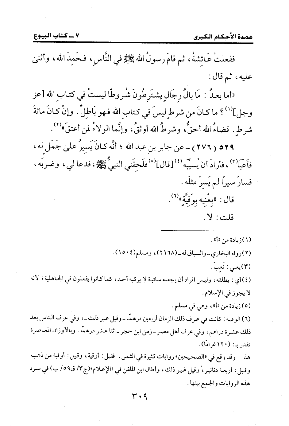 "أما بعدُ: مَا بالُ رِجَالٍ يشتَرِطُونَ شُروطًا ليستْ في كتابِ الله [عز وجل] (¬1)؟ ما كانَ من شرطٍ ليسَ في كتابِ الله فهو بَاطِلٌ. وإنْ كانَ مائةَ شرطٍ. قضاءُ الله أحقُّ، وشرطُ الله أوثقُ، وإنَّما الولاءُ لمن أعتقَ" (¬2).