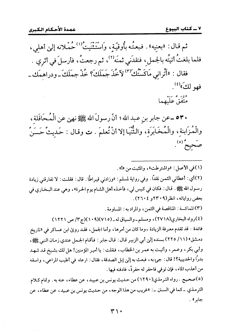 530 - عن جابر بنِ عبد الله؛ أنّ رسولَ الله - صلى الله عليه وسلم - نهى عن الْمُحَاقَلةِ، والْمُزَابنةِ، والْمُخَابَرَةِ، والثُّنْيَا إلا أنْ تُعلمَ. ت وقال: حَدِيثٌ حَسَنٌ وصَحِيحٌ (¬5).