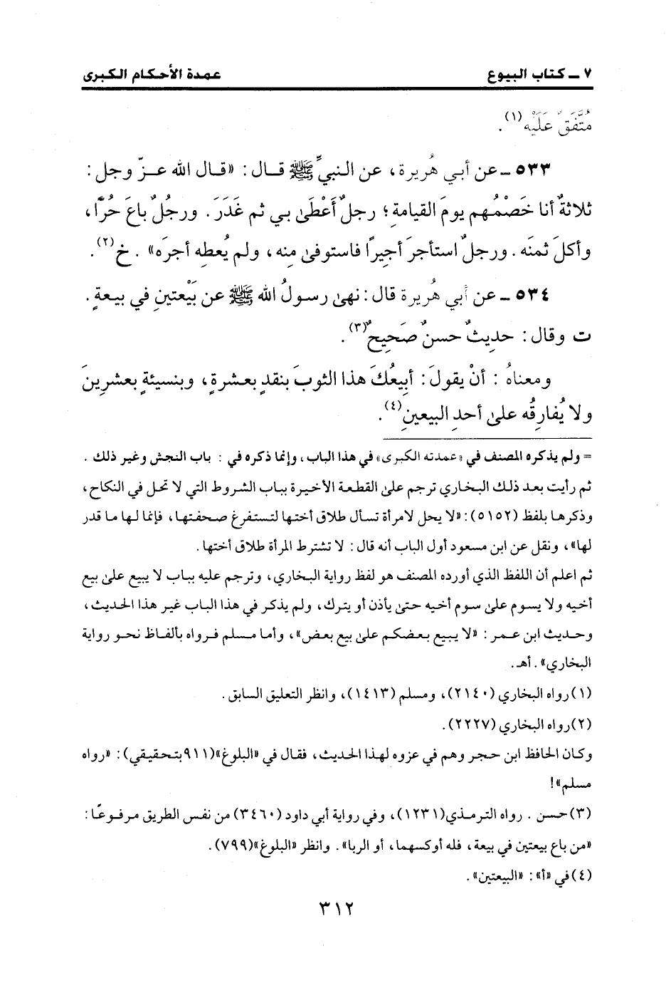 533 - عن أبي هُريرة، عن النبيِّ - صلى الله عليه وسلم - قال: "قال الله عزّ وجل: ثلاثةٌ أنا خَصْمُهم يومَ القيامةِ؛ رجلٌ أَعْطَى بي ثم غَدَرَ. ورجُلٌ باعَ حُرًا، وأكلَ ثمنَه. ورجلٌ استأجرَ أجِيرًا فاستوفى مِنه، ولم يُعطِه أجرَه". خ (¬2).