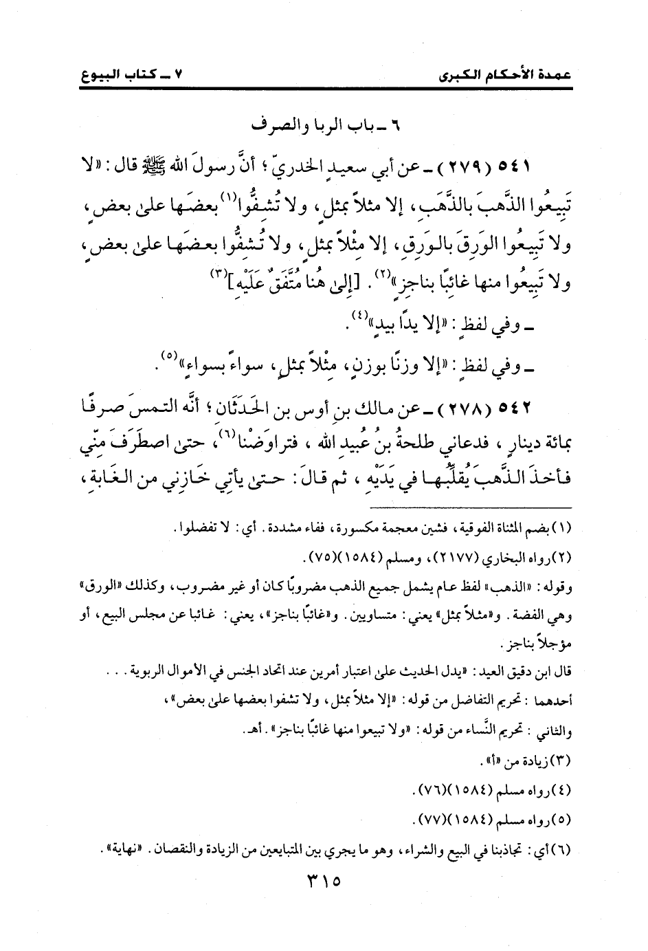 541 (279) - عن أبي سعيدٍ الخدريّ؛ أنَّ رسولَ الله - صلى الله عليه وسلم - قال: "لا تَبِيعُوا الذَّهبَ بالذَّهَبِ، إلا مثلًا بمثلٍ، ولا تُشِفُّوا (¬1) بعضَها على بعض، ولا تَبِيعُوا الوَرِقَ بالوَرِقِ، إلا مِثْلًا بمثلٍ، ولا تُشِفُّوا بعضَها على بعضٍ، ولا تَبِيعُوا منها غائِبًا بناجِزٍ" (¬2). [إِلى هُنا مُتَفَقٌ عَلَيْهِ] (¬3)