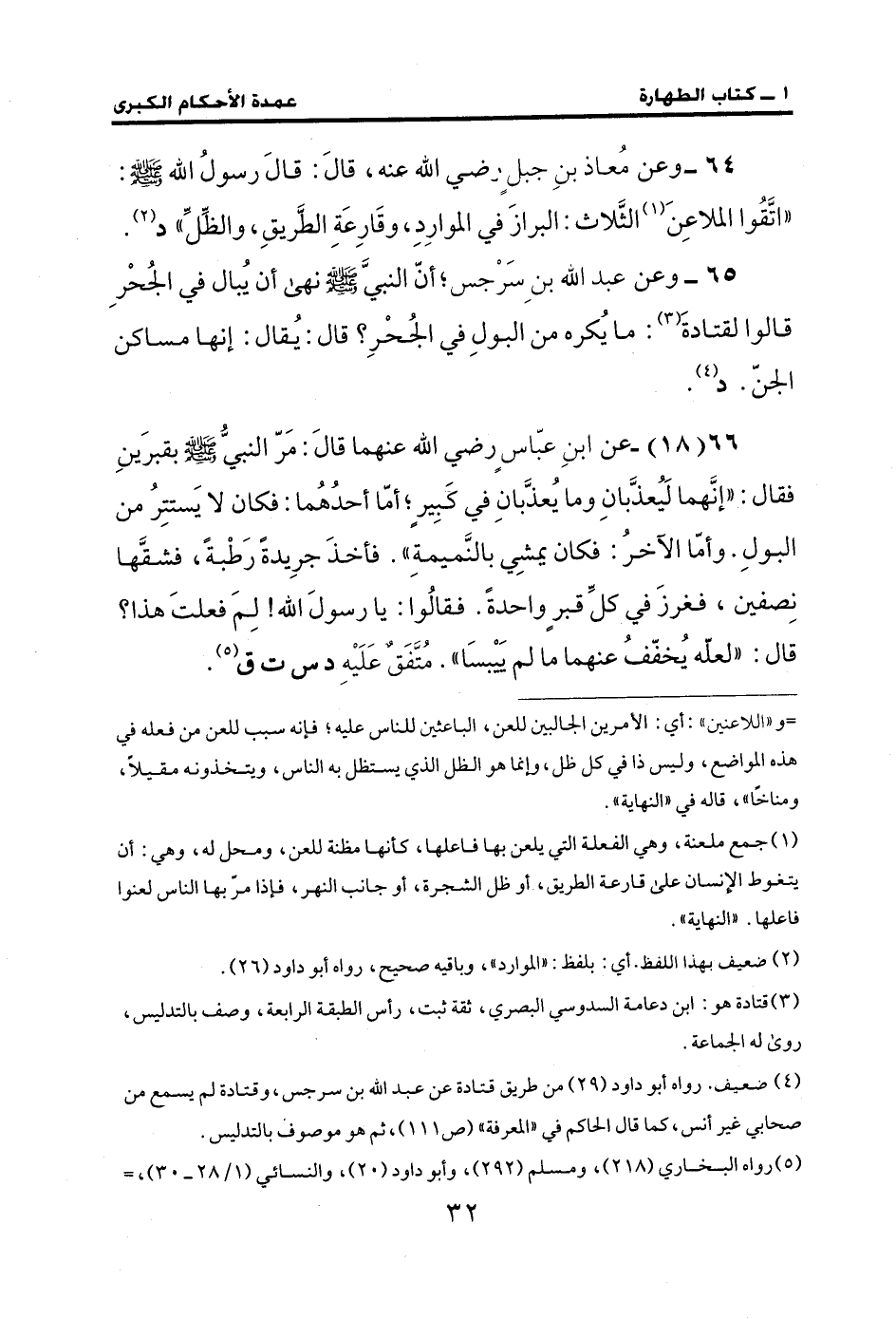 64 - وعن مُعاذ بنِ جبلٍ رضي الله عنه، قالَ: قالَ رسولُ الله - صلى الله عليه وسلم -: "اتَقُوا الملاعِنَ (¬1) الثَّلاث: البرازَ في الموارِدِ، وقَارِعَةِ الطَريقِ، والظِّلِّ" د (¬2).