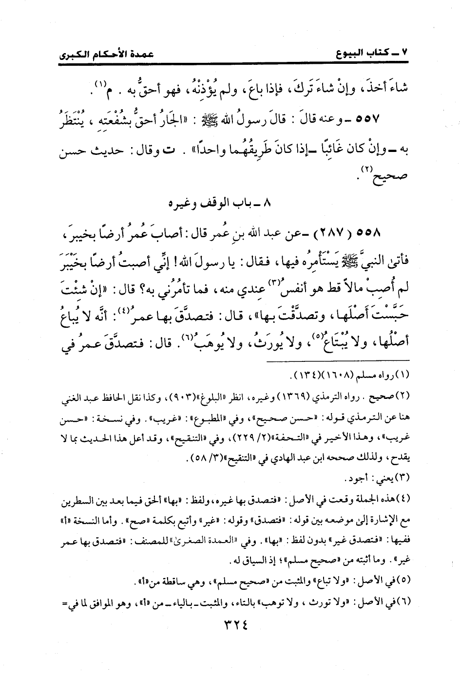558 (287) - عن عبد الله بنِ عُمر قال: أصابَ عُمرُ أرضًا بخيبرَ، فأتى النبيَّ - صَلَّى الله عليه وسلم - يَسْتَأْمِرُه فيها، فقال: يا رسولَ الله! إنَي أصبتُ أرضًا بخَيْبَرَ لم أُصِبْ مالًا قط هو أنفسُ (¬3) عِندي منه، فما تأمُرُني به؟ قال: "إنْ شِئْتَ حَبسْتَ أَصْلَها، وتصدَّقْتَ بها"، قال: فتصدقَ بها عمرُ (¬4): أنَّه لا يُباعُ أصْلُها، ولا يُبْتَاع (¬5)، ولا يُورَثُ، ولا يُوهَبُ (¬6). قال: فتصدَّقَ عمرُ في