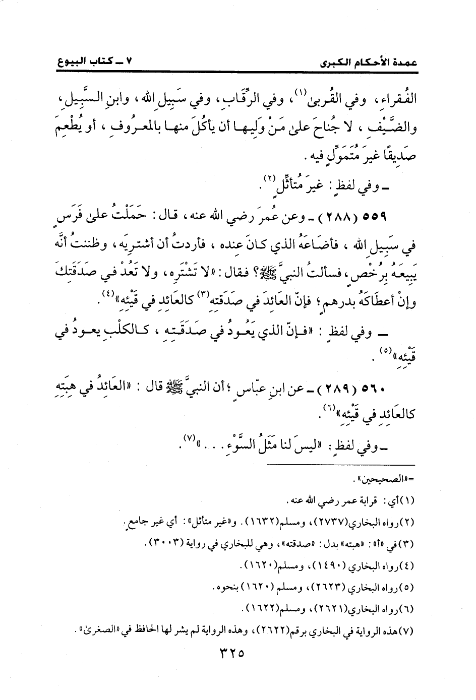 559 (288) - وعن عُمرَ رضي الله عنه، قال: حَمَلْتُ على فَرَس في سَبِيلِ الله، فأضَاعَهُ الذي كانَ عِنده، فأردتُ أن أشترِيَه، وظننتُ أنَّه يَبِيعَهُ بِرُخْصٍ، فسألتُ النبيَّ - صَلَّى الله عليه وسلم -؟ فقال: "لا تَشْتَرِه، ولا تَعُدْ في صَدَقَتِكَ وإنْ أعطَاكَهُ بدرهمٍ؛ فإنّ العَائِدَ في صَدَقتِهِ (¬3) كالعَائِدِ في قَيْئِهِ" (¬4).