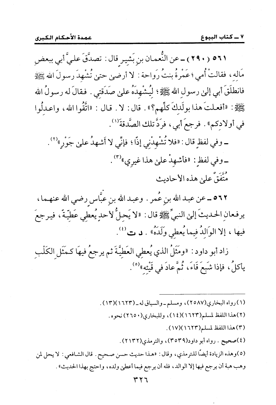561 (290) - عن النُّعمان بنِ بَشِير قال: تصدَّقَ عليَّ أبي ببعضِ مَالِهِ، فقالتْ أُمي؛ عَمْرةُ بنتُ رَواحة: لا أرضى حتى تُشْهِدَ رسول الله - صلى الله عليه وسلم - فانطلَقَ أبي إلى رسول الله - صلى الله عليه وسلم -؛ لِيُشْهِدَهُ على صَدَقتِي. فقالَ له رسول الله - صلى الله عليه وسلم -: "أفعلتَ هذا بولَدِكَ كلهم؟ ". قال: لا. قال: "اتَّقُوا الله، واعدِلُوا في أولادِكم". فرجعَ أبي، فرَد تلك الصَّدقةَ (¬1).