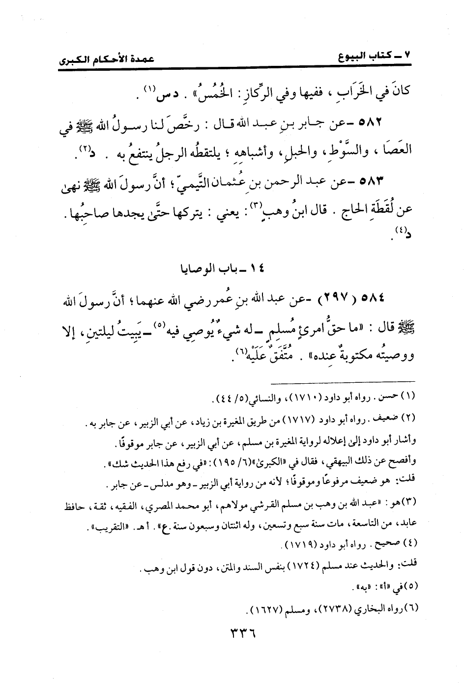 584 (297) - عن عبد الله بنِ عمر رضي الله عنهما؛ أنَّ رسولَ الله - صلى الله عليه وسلم - قال: "ما حقُّ امرئٍ مُسلِمٍ - له شيءٌ يُوصِي فيه (¬5) - يَبيتُ ليلتينِ، إلا ووصيتُه مكتوبةٌ عِنده". مُتَّفَقٌ عَلَيْه (¬6).