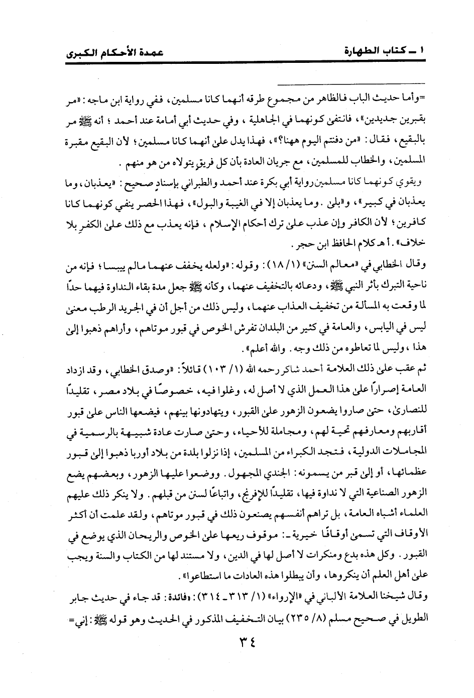 ويقوي كونهما كانا مسلمين رواية أبي بكرة عند أحمد والطبراني بإسنادٍ صحيح: "يعذبان، وما يعذبان في كبير"، و"بلى. وما يعذبان إلا في الغيبة والبول"، فهذا الحصر ينفي كونهما كانا كافرين؛ لأن الكافر وإن عذب على ترك أحكام الإسلام، فإنه يعذب مع ذلك على الكفرِ بلا خلاف". أهـ كلام الحافظ ابن حجر.