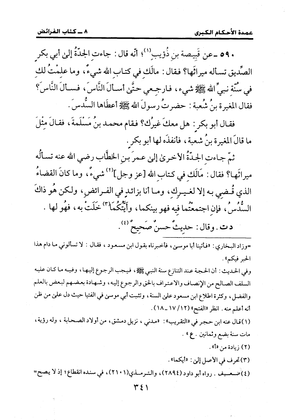 590 - عن قَبِيصه بنِ ذُؤيبٍ (¬1)؛ أنّه قال: جاءتِ الجدّة إلى أبي بكرٍ الصِّديق تسأله ميراثَها؟ فقال: مالَكِ في كتابِ الله شيءٌ، وما علِمْتُ لكِ في سُنّةِ نبيِّ الله - صلى الله عليه وسلم - شيء، فارجِعي حتَّى أسألَ النَّاسَ، فسألَ النَّاسَ؟ فقال المغيرة بن شُعبة: حضرت رسولَ الله - صلى الله عليه وسلم - أعطَاها السُّدسَ.