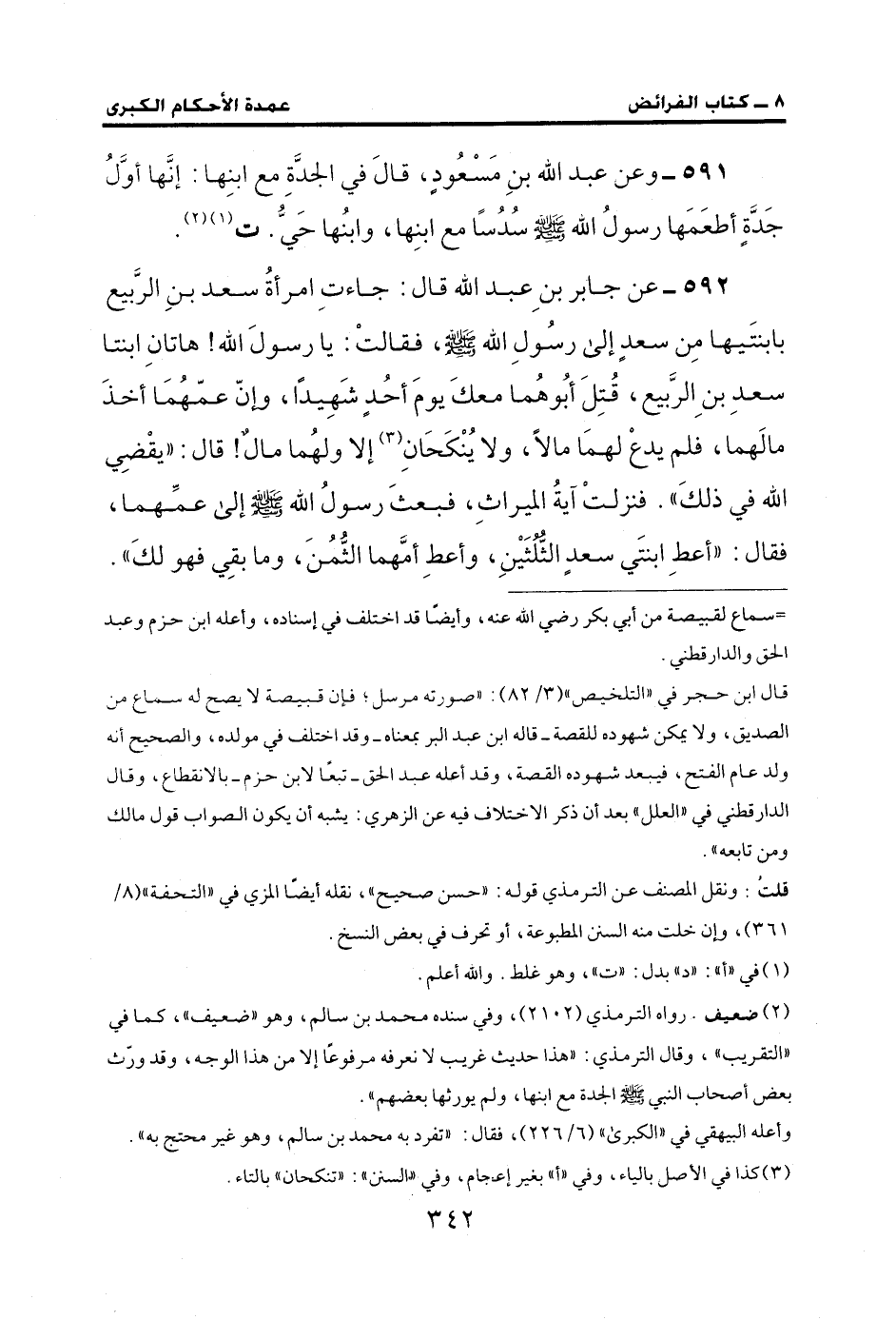 592 - عن جابر بنِ عبد الله قال: جاءتِ امرأةُ سعد بنِ الرَّبيع بابنتَيها مِن سعدٍ إلى رسُولِ الله - صلى الله عليه وسلم -، فقالتْ: يا رسولَ الله! هاتانِ ابنتا سعدِ بنِ الرَّبيع، قُتِلَ أبُوهُما معكَ يومَ أحُدٍ شَهِيدًا، وإنّ عمّهُمَا أخذَ مالَهما، فلم يدعْ لهمَا مالًا، ولا يُنْكَحَانِ (¬3) إلا ولهُما مالٌ! قال: "يقْضِي الله في ذلكَ". فنزلتْ آيةُ الميراثِ، فبعثَ رسولُ الله - صلى الله عليه وسلم - إلى عمِّهما، فقال: "أعطِ ابنتَي سعدٍ الثُّلثَيْنِ، وأعطِ أمَّهما الثُمُنَ، وما بقِي فهو لكَ".