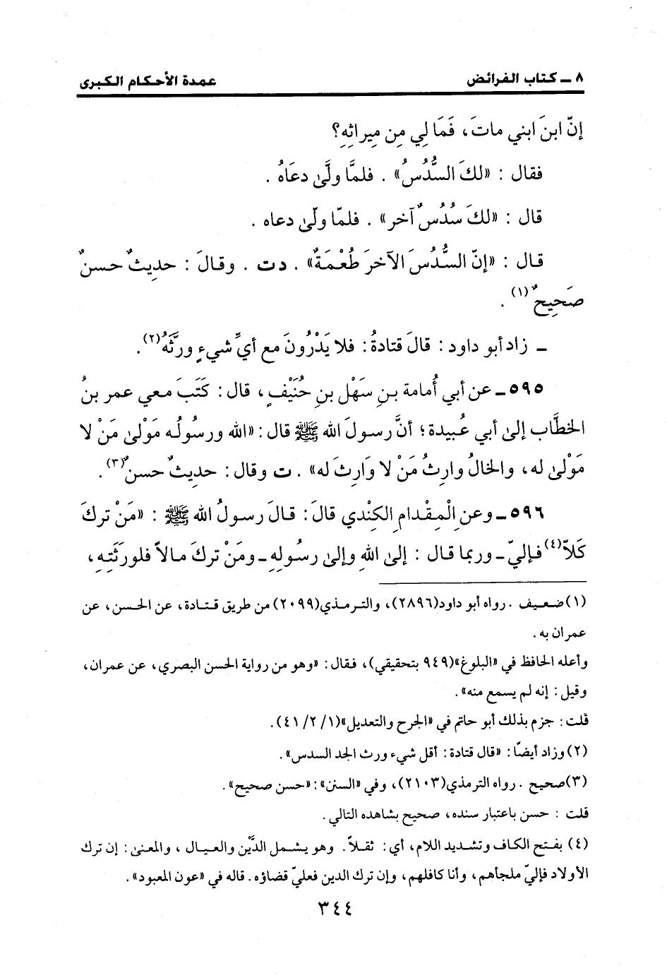 595 - عن أبي أُمامة بنِ سَهْل بنِ حُنَيْفٍ، قال: كَتَبَ معي عمر بنُ الخطَاب إلى أبي عُبيدة؛ أنَّ رسولَ الله - صلى الله عليه وسلم - قال: "الله ورسُولُه مَوْلى مَنْ لا مَوْلى له، والخالُ وارِثُ مَنْ لا وَارِثَ له". وقال: حدِيثٌ حسنٌ (¬3).