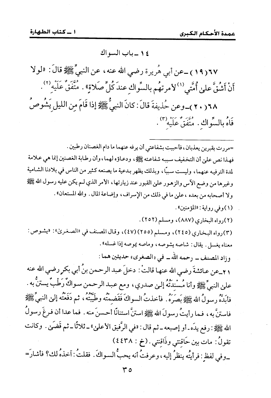 67 (19) - عن أبي هُريرة رضي الله عنه، عن النبيِّ - صلى الله عليه وسلم - قالَ: "لولا أَنْ أَشُقَّ على أُمَّتي (¬1) لأمرتهُم بالسِّواكِ عندَ كُلِّ صَلاةٍ". مُتَّفَقٌ عَلَيْهِ (¬2).