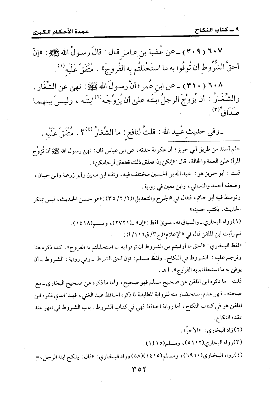 قلت. ما ذكره ابن الملقن عن صحيح مسلم فهو صحيح، وأما ما ذكره عن صحيح البخاري- مع صحته- فهو عدم استحضار منه للرواية المطابقة لما ذكره الحافظ عبد الغني، فهذا الذي ذكره ابن الملقن هو في كتاب النكاح، أما رواية الحافظ فهي في كتاب الشروط. باب الشروط في المهر عند عقدة النكاح.