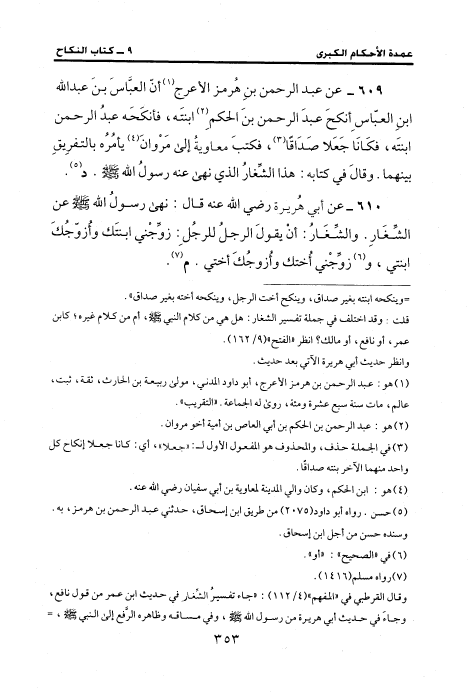 609 - عن عبد الرحمن بنِ هُرمز الأعرج (¬1) أنّ العبَّاسَ بنَ عبد الله ابنِ العبّاس أِنكحَ عبدَ الرحمن بنَ الحكم (¬2) ابنتَه، فأنكَحَه عبدُ الرحمن ابنتَه، فكَانَا جَعَلا صَدَاقًا (¬3)، فكتبَ معاويةُ إلى مَرْوانَ (¬4) يأمُرُه بالتفرِيقِ بينهما. وقالَ في كتابه: هذا الشِّغارُ الذي نهى عنه رسولُ الله - صلى الله عليه وسلم -.د (¬5).