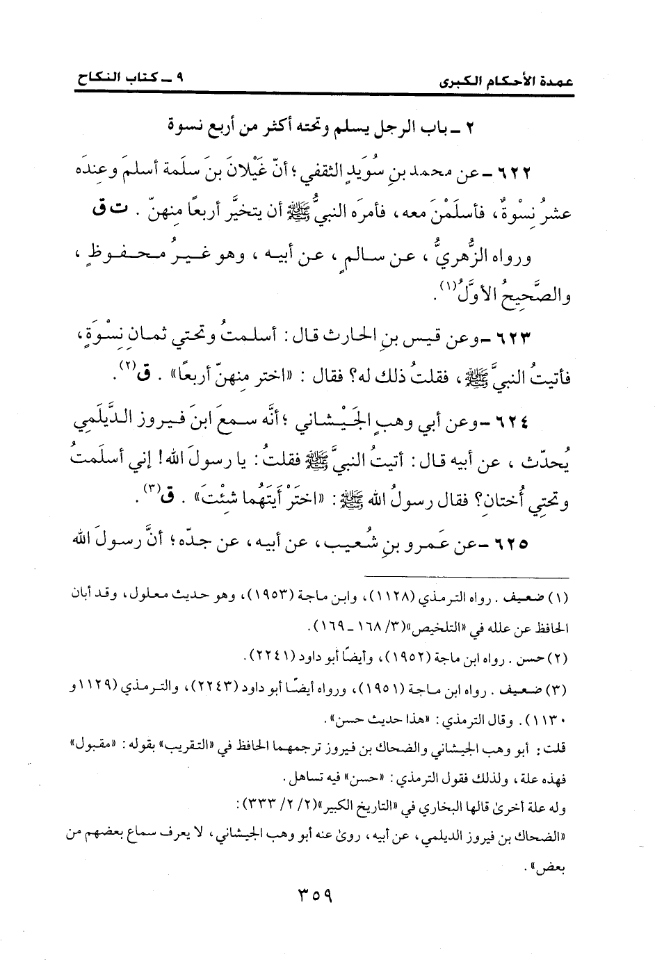 623 - وعن قيس بنِ الحارث قال: أسلمتُ وتحتي ثمانِ نِسْوَةٍ، فأتيت النبي - صلى الله عليه وسلم -، فقلتُ ذلك له؟ فقال: "اختر مِنهنّ أربعًا". ق (¬2).