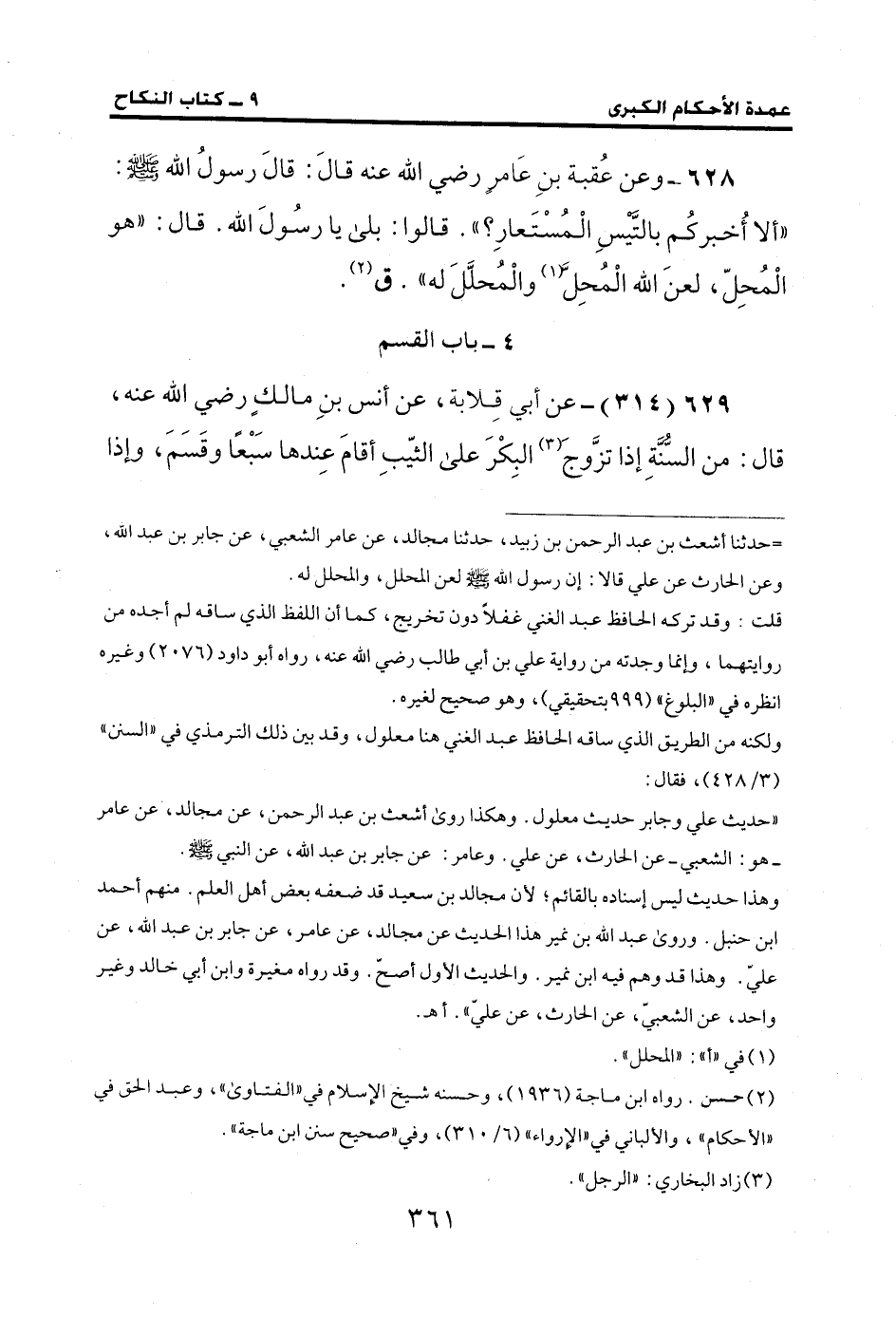 628 - وعن عُقبة بنِ عَامرِ رضي الله عنه قالَ: قالَ رسولُ الله - صلى الله عليه وسلم -: "ألا أُخبركُم بالتَّيسِ الْمُسْتَعارِ؟ ". قالوا: بلى يا رسُولَ الله. قال: "هو المحِلّ، لعنَ الله الْمُحِل (¬1) والمُحلَّلَ له". ق (¬2).