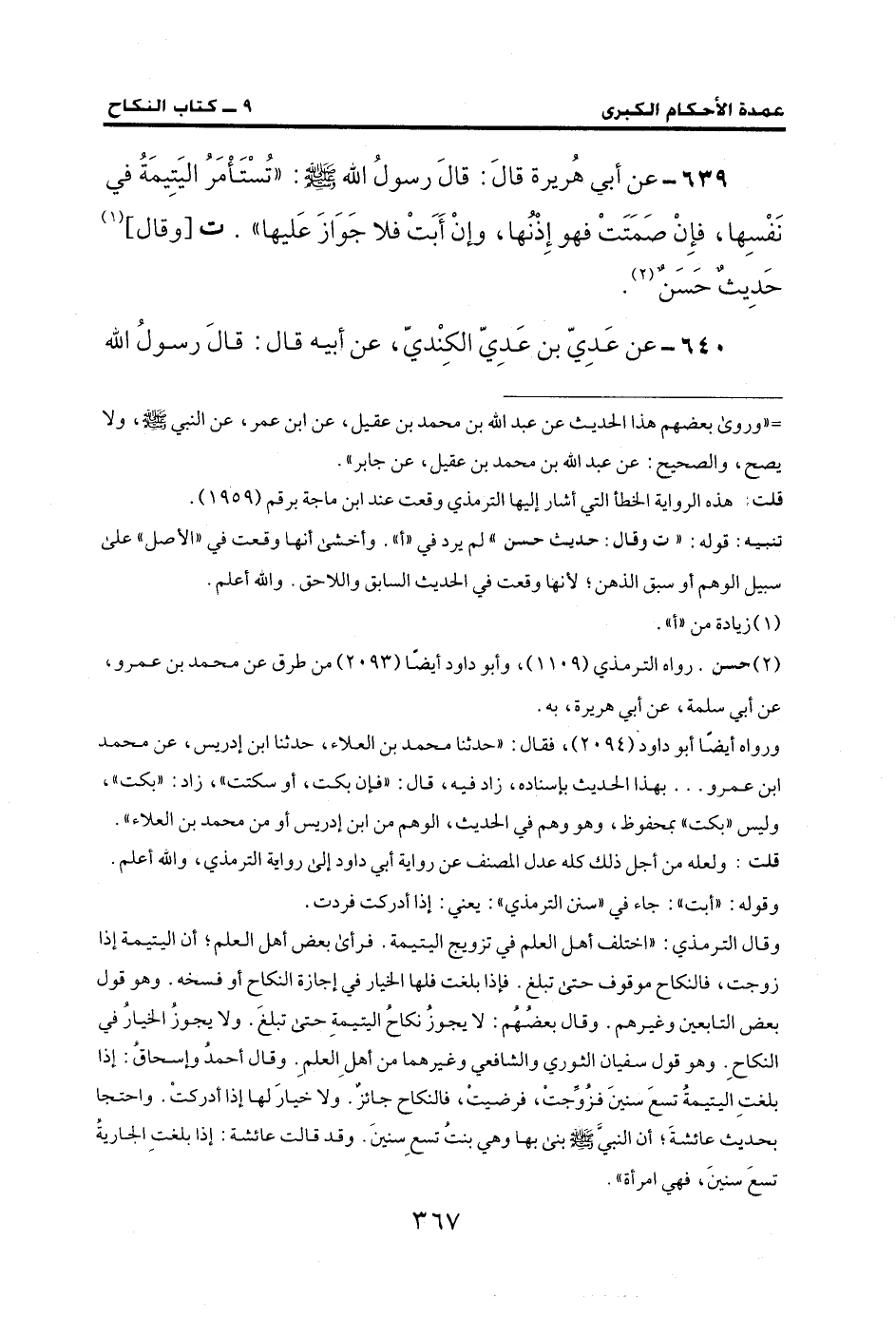 وقال الترمذي: "اختلف أهل العلم في تزويج اليتيمة. فرأى بعض أهل العلم؛ أن اليتيمة إذا زوجت، فالنكاح موقوف حتى تبلغ. فإذا بلغت فلها الخيار في إجازة النكاح أو فسخه. وهو قول بعض التابعين وغيرهم. وقال بعضهُم: لا يجوزُ نكاحُ اليتيمةِ حتى تبلغَ. ولا يجوزُ الخيارُ في النكاحِ. وهو قول سفيان الثورى والشافعي وغيرهما من أهلِ العلمِ. وقال أحمدُ وإسحاق: إذا بلغتِ اليتيمة تسعَ سنينَ فزوِّجت، فرضيتْ، فالنكاح جائرٌ. ولا خيارَ لها إذا أدركت. واحتجا بحديث عائشةَ؛ أن النبيَّ - صلى الله عليه وسلم - بنى بها وهي بنتُ تسعِ سنينَ. وقد قالت عائشة: إذا بلغتِ الجاريةُ تسعَ سنينَ، فهي امرأة".