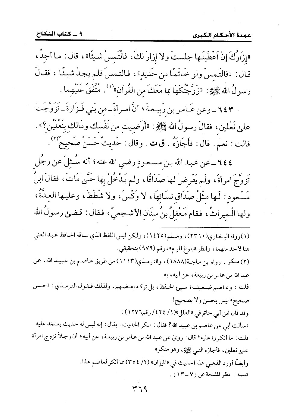 643 - وعن عَامر بنِ رَبِيعةَ؛ أنَّ امرأةً- مِن بَني فَزَارةَ- تَزَوَّجَتْ على نَعْلين، فقال رسول الله - صلى الله عليه وسلم -: "أَرَضِيتِ من نَفْسِك ومَالكِ بِنَعْلَيْن؟ ". قالت: نعم. قال: فأَجَازَهُ. ق ت. وقال: حَدِيثٌ حَسَنٌ صَحِيحٌ (¬2).
