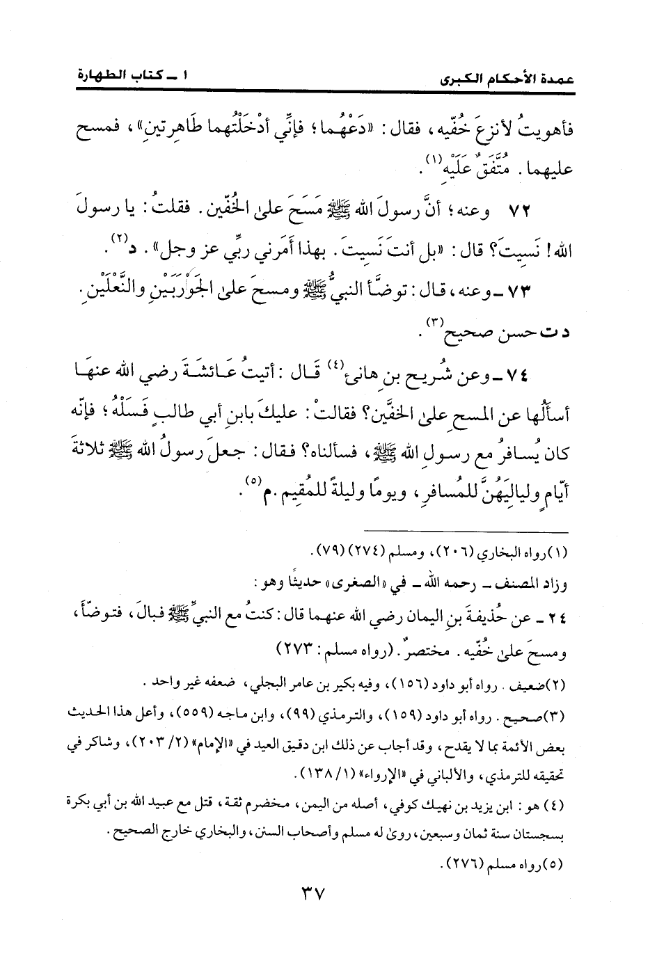 74 - وعن شُريح بنِ هانئ (¬4) قَال: أتيتُ عَائشَةَ رضي الله عنهَا أسأَلُها عن المسحِ على الخفَّين؟ فقالتْ: عليكَ بابنِ أبي طالبٍ فَسَلْهُ؛ فإنّه كان يُسافرُ مع رسولِ الله - صلى الله عليه وسلم -، فسألناه؟ فقال: جعلَ رسولُ الله - صلى الله عليه وسلم - ثلاثةَ أيّامٍ وليالِيَهُنَّ للمُسافرِ، ويومًا وليلةً للمُقِيم. م (¬5).