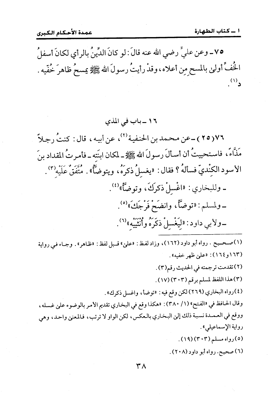 76 (25) - عن محمد بن الحنفية (¬2)، عن أبيه، قال: كنتُ رجلًا مَذَّاءً، فاستحييتُ أن أسألَ رسولَ الله - صلى الله عليه وسلم - لمكان ابنَتِه- فأمرتُ المقداد بنَ الأسود الكِنْديّ فسألهُ؟ فقال: "يغسِلُ ذكرَهُ، ويتوضَّأُ". مُتَّفَقٌ عَلَيْهِ (¬3).