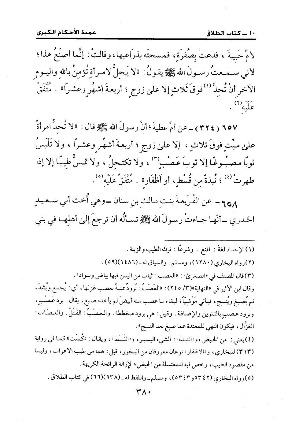 657 (324) - عن أمِّ عطيةَ؛ أنَّ رسولَ الله - صلى الله عليه وسلم - قال: "لا تُحِدُّ امرأةٌ على ميِّتٍ فوقَ ثلاثٍ، إلا على زوجٍ؛ أربعةَ أشهُرٍ وعشرًا، ولا تَلْبَسُ ثوبًا مصبُوغًا إلا ثوبَ عَصْبٍ (¬3)، ولا تكتحِلُ، ولا تمسُّ طِيبًا إلا إذا طهرتْ (¬4)؛ نُبدةً من قُسْطٍ، أو أَظْفَارٍ". متَّفَقٌ عَلَيْهِ (¬5).