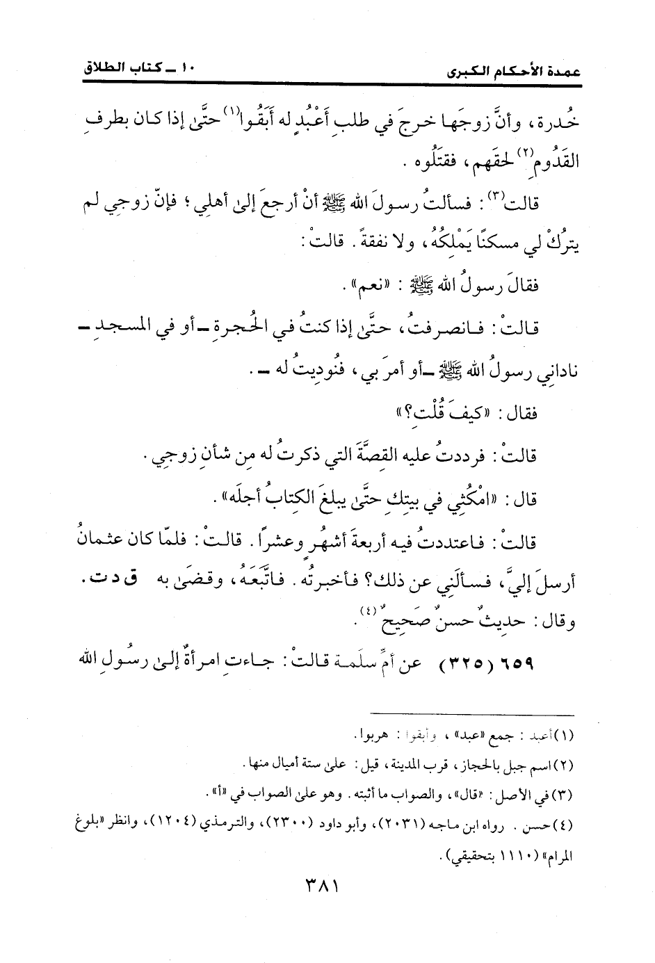 قالتْ: فاعتددتُ فيه أربعةَ أشهُر وعشرًا. قالتْ: فلمّا كان عثمانُ أرسلَ إليَّ، فسألَنِي عن ذلك؟ فأخبرتُه. فاتَّبَعَهُ، وقضَى به. ق د ت. وقال: حدِيثٌ حسنٌ صَحِيحٌ (¬4).