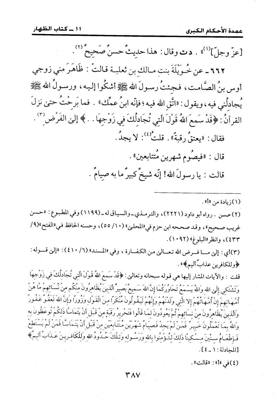 662 - عن خُوَيْلَةَ بنت مالكِ بن ثعلبة قالمت: ظَاهَرَ مني زوجي أوس بنُ الصَّامت، فجِئتُ رسولَ الله - صلى الله عليه وسلم - أشكُوا إليه، ورسولُ الله - صلى الله عليه وسلم - يُجادِلُني فيه، ويقول: "اتَّقِ الله فيه؛ فإنّه ابنُ عمِّك". فما بَرحتُ حتى نزلَ القرْآنُ: {قَدْ سَمِعَ اللهُ قَوْلَ الّتِي تُجَادِلُكَ فِي زَوْجِهَا ..} إلى الفَرْضِ (¬3).