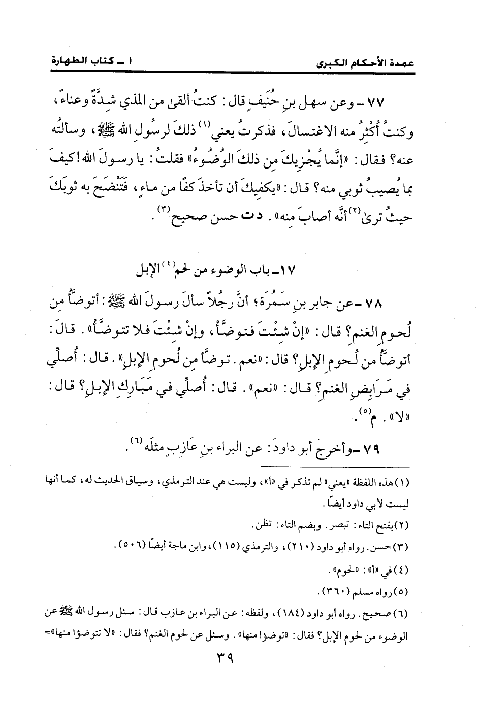 78 - عن جابر بنِ سَمُرَة؛ أن رجُلًا سالَ رسولَ الله - صلى الله عليه وسلم -: أتوضَّأُ مِن لُحومِ الغنم؟ قال: "إنْ شِئْتَ فتوضَّأْ، وإنْ شِئْتَ فلا تتوضَّأْ". قالَ: أتوضَّأُ من لُحومِ الإِبل؟ قال: "نعم. توضَّأ مِن لُحومِ الإبل". قال: أُصلِّي في مَرَابِضِ الغنم؟ قال: "نعم". قال: أُصلِّي في مَبَارِكِ الإِبلِ؟ قال: "لا". م (¬5).