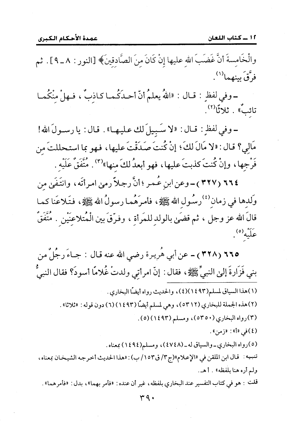 664 (327) - وعن ابنِ عُمر؛ أن رجلًا رمى امرأتَه، وانتَفَى مِن وَلدِها في زمانِ (¬4) رسُولِ الله - صلى الله عليه وسلم -، فأمرَهُما رسولُ الله - صلى الله عليه وسلم -، فتَلاعَنا كما قالَ الله عز وجل، ثم قضَى بالولد للمَرأة، وفرّقَ بين الْمُتلاعنَيْن. مُتَّفَقٌ عَلَيْهِ (¬5).