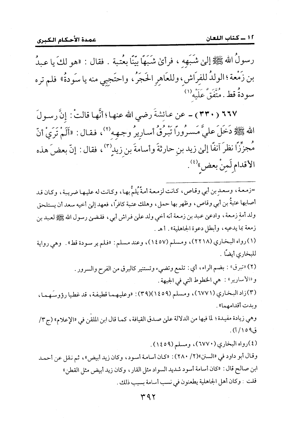 667 (330) - عن عائِشةَ رضي الله عنها؛ أنَها قالتْ: إِنَّ رسولَ الله - صلى الله عليه وسلم - دَخَلَ عليَّ مَسرُورًا تَبْرُقُ أسارِيرُ وجهِهِ (¬2)، فقال: "أَلَمْ تَرَيْ أنّ مُجزِّزًا نظرَ آنفًا إلى زيد بنِ حارثةَ وأسامةَ بن زيدٍ (¬3)، فقال: إنّ بعضَ هذه الأقدام لِمِنْ بعضٍ" (¬4).