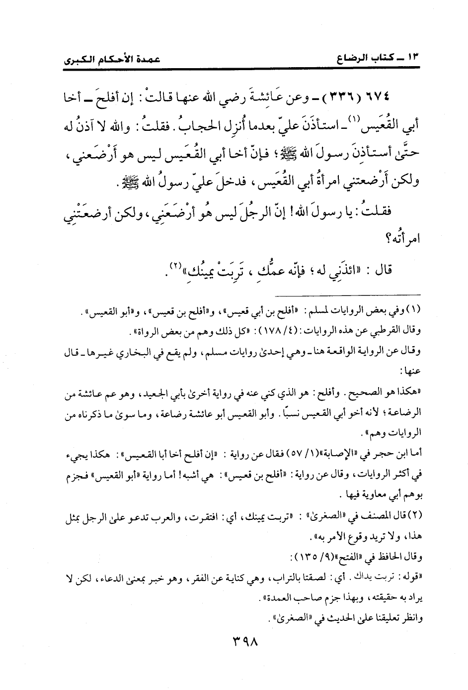 674 (336) - وعن عَائِشةَ رضي الله عنها قالتْ: إن أفلحَ - أخا أبي القُعَيس (¬1) - استأذَنَ عليّ بعدما أُنزِل الحجابُ. فقلتُ: والله لا آذنُ له حتَّى أستأذِنَ رسولَ الله - صلى الله عليه وسلم -؛ فإنّ أخا أبي القُعَيس ليس هو أَرْضَعني، ولكن أَرْضعتني امرأةُ أبي القعَيس، فدخلَ عليّ رسولُ الله - صلى الله عليه وسلم -.