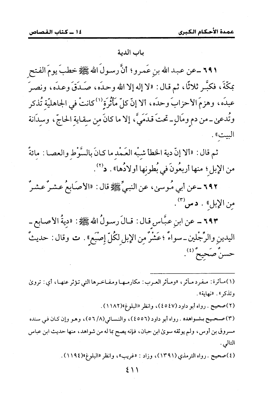 693 - عن ابن عبَّاس قال: قالَ رسولُ الله - صلى الله عليه وسلم -: "دِيةُ الأصابع - اليدينِ والرِّجْلين - سواءٌ؛ عَشْرٌ مِن الإبلِ لكُلّ إِصْبَع". ت وقال: حديثٌ حسنٌ صحِيحٌ (¬4).