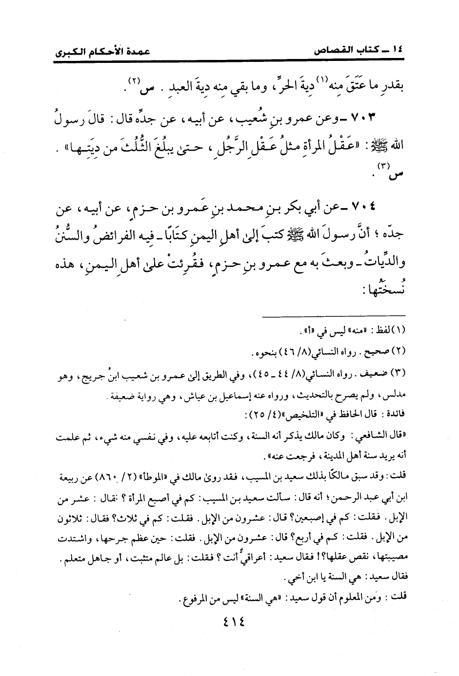 703 - وعن عمرو بنِ شُعيب، عن أبيه، عن جدِّه قال: قالَ رسولُ الله - صلى الله عليه وسلم -: "عَقْلُ المرأةِ مثلُ عَقْلِ الرَّجُلِ، حتى يبلُغَ الثُّلُثَ من دِيَتِها". س (¬3).