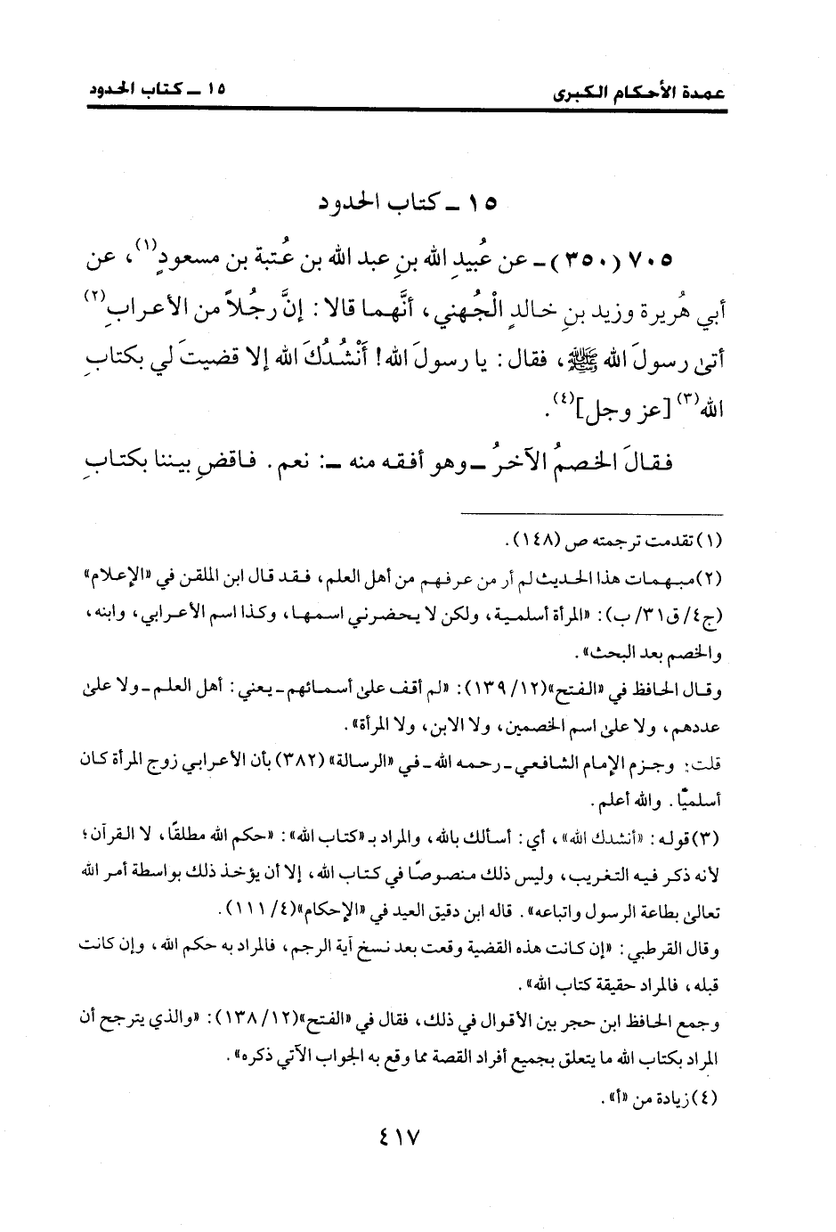 705 (350) - عن عُبيدِ الله بنِ عبد الله بن عُتبة بن مسعودٍ (¬1)، عن أبي هُريرة وزيد بنِ خالدٍ الْجُهني، أنَّهما قالا: إنَّ رجُلًا من الأعرابِ (¬2) أتى رسولَ الله - صلى الله عليه وسلم -، فقال: يا رسولَ الله! أَنْشُدُكَ الله إلا قضيتَ لي بكتابِ الله (¬3) [عز وجل] (¬4).
