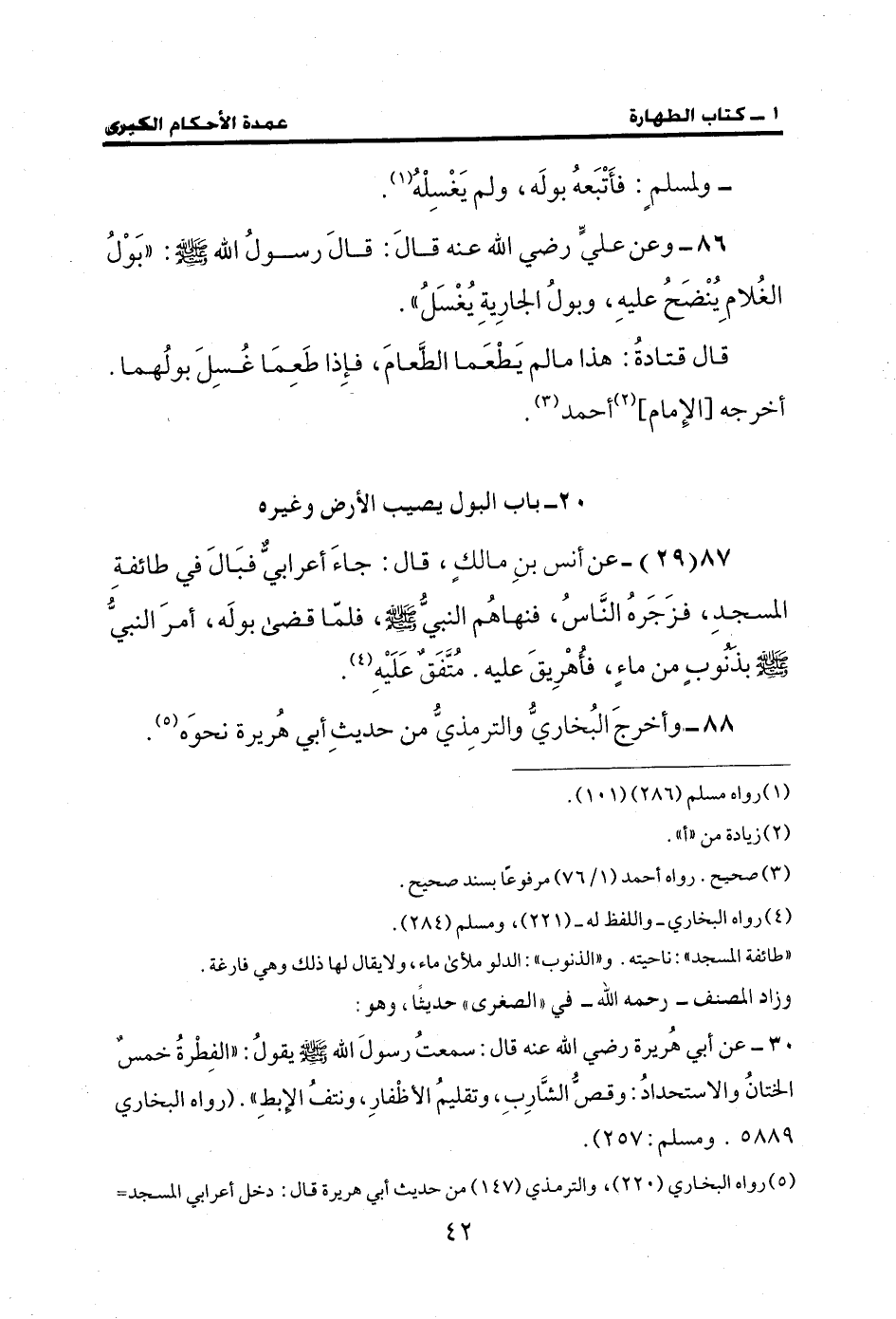 87 (29) - عن أنس بنِ مالكٍ، قال: جاءَ أعرابيٌّ فبَالَ في طائفةِ المسجدِ، فزَجَرهُ النَّاسُ، فنهاهُم النبىُّ - صلى الله عليه وسلم -، فلمّا قضى بولَه، أمرَ النبيُّ - صلى الله عليه وسلم - بذَنُوبٍ من ماءٍ، فأُهْرِيقَ عليه. مُتَّفَقٌ عَلَيْهِ (¬4).
