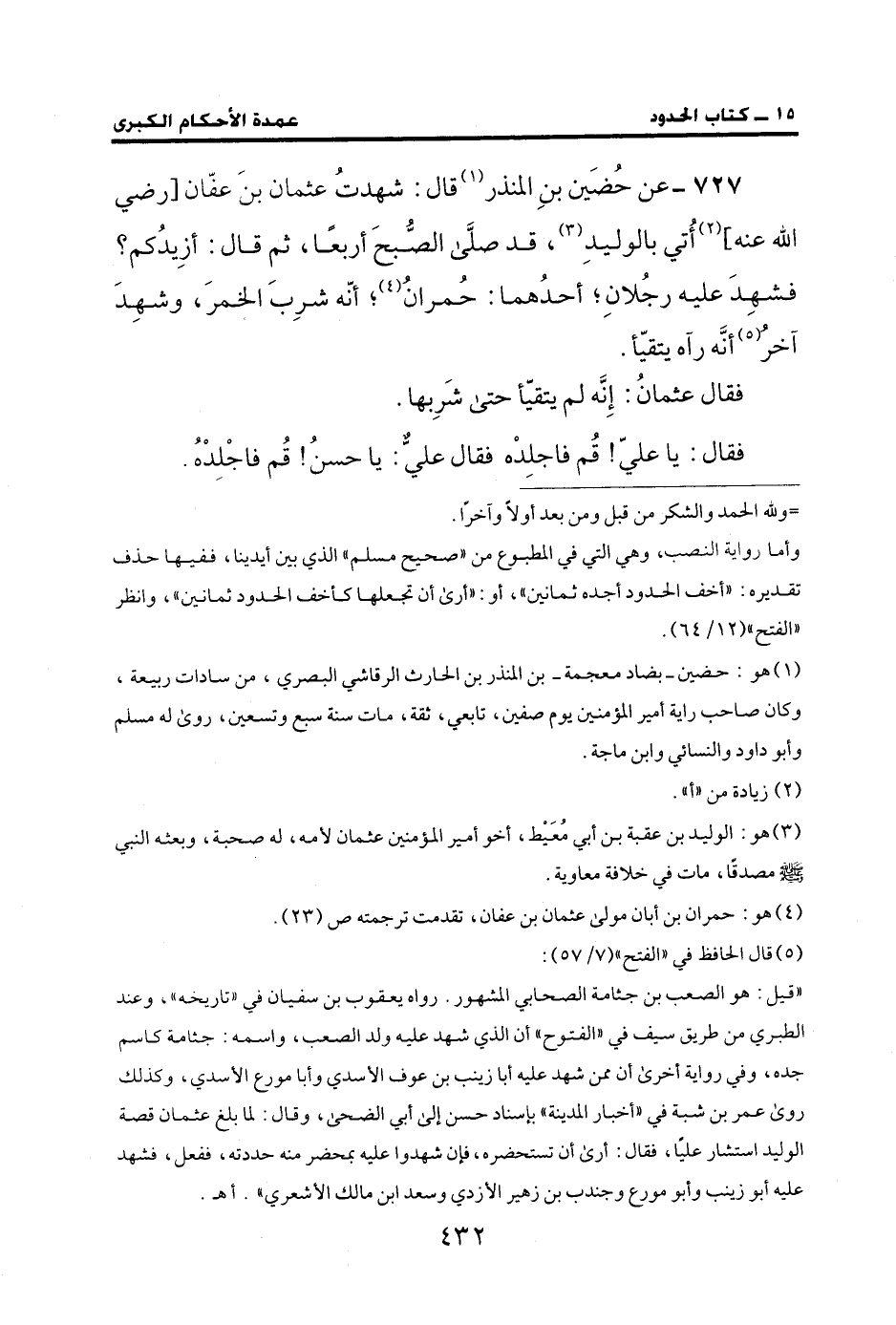 727 - عن حُضَين بنِ المنذر (¬1) قال: شهدتُ عثمان بنَ عفّان [رضي الله عنه] (¬2) أُتي بالوليدِ (¬3)، قد صلَّى الصُّبحَ أربعًا، ثم قال: أزِيدُكم؟ فشهِدَ عليه رجُلانِ؛ أحدُهما: حُمران (¬4)؛ أنّه شرِبَ الخمرَ، وشهِدَ آخر (¬5) أنَّه رآه يتقيّأ.
