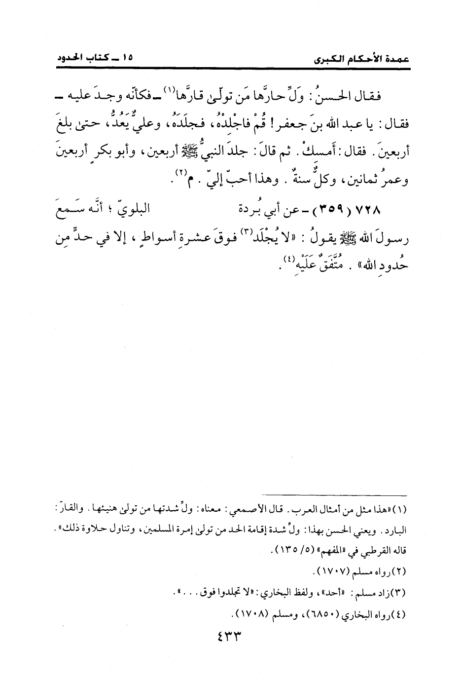 728 (359) - عن أبي بُردة البلويّ؛ أنَّه سَمعَ رسولَ الله - صلى الله عليه وسلم - يقولُ: "لا يُجْلَد (¬3) فوقَ عشرةِ أسواطٍ، إلا في حدٍّ مِن حُدودِ الله". مُتَّفَقٌ عَلَيْهِ (¬4).