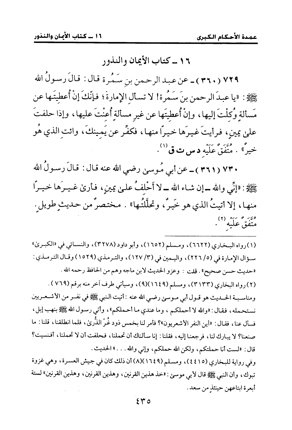 729 (360) - عن عبد الرحمن بنِ سَمُرة قال: قالَ رسولُ الله - صلى الله عليه وسلم -: "يا عبدَ الرحمن بنَ سَمُرة! لا تسألِ الإِمارةَ؛ فإنّكَ إنْ أُعطِيتَها عن مَسألةٍ وُكِلْتَ إليها، وإنْ أُعطِيتَها عن غيرِ مسألةٍ أُعِنْتَ عليها، وإذا حلفتَ على يمينٍ، فرأيتَ غيرَها خيرًا منها، فكفِّر عن يَمِينكَ، وائتِ الذي هُو خيرٌ". مُتَّفَقٌ عَلَيْهِ د س ت ق (¬1).