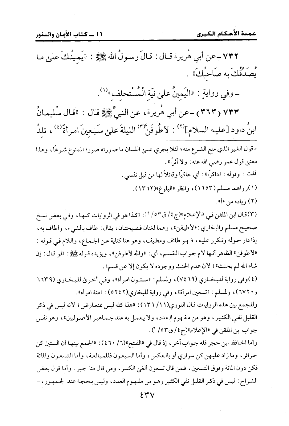 733 (363) - عن أبي هُريرة، عن النبيِّ - صلى الله عليه وسلم - قال: "قال سُليمانُ ابنُ داود [عليه السلام] (¬2): لأطُوفَنَّ (¬3) الليلةَ على سَبعِينَ امرأةً (¬4)، تلِدُ