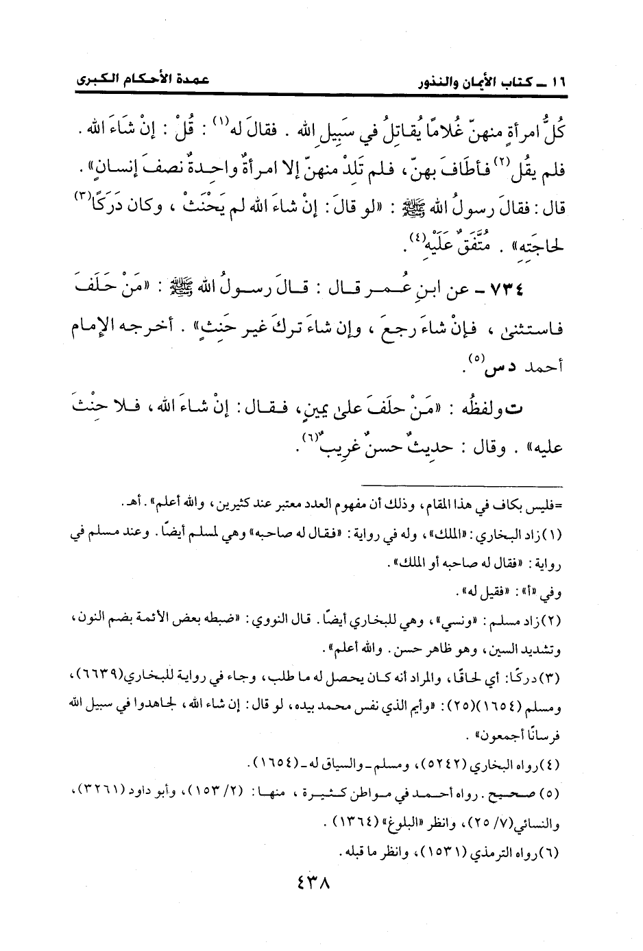 734 - عن ابنِ عُمر قال: قالَ رسولُ الله - صلى الله عليه وسلم -: "مَنْ حَلَفَ فاستثنى، فإنْ شاءَ رجعَ، وإن شاءَ تركَ غير حَنِثٍ". أخرجه الإمام أحمد د س (¬5).