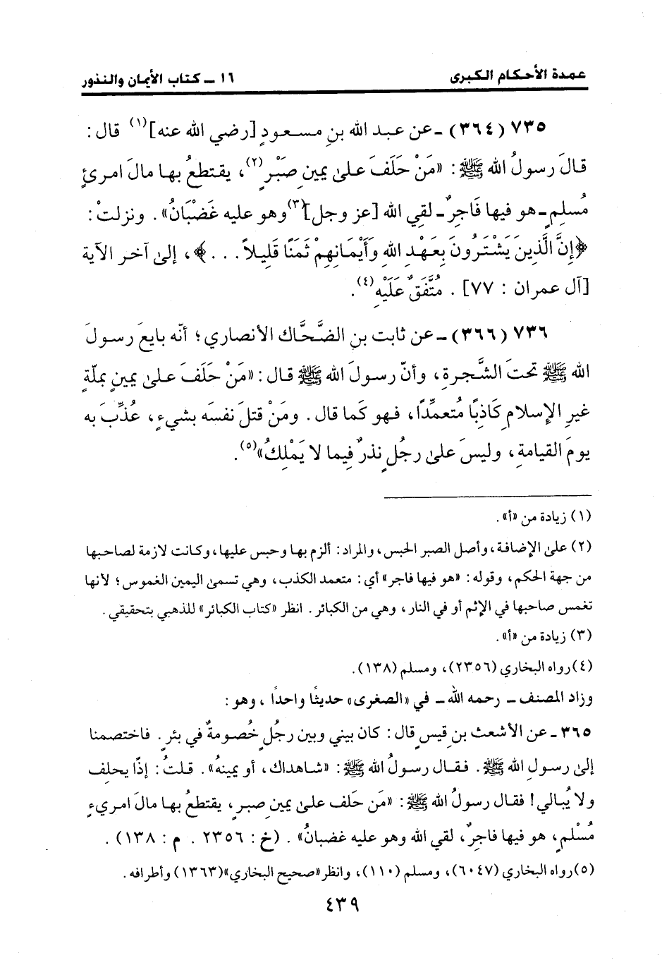 735 (364) - عن عبد الله بنِ مسعودٍ [رضي الله عنه] (¬1) قال: قالَ رسولُ الله - صلى الله عليه وسلم -: "مَنْ حَلَفَ على يمين صَبْرٍ (¬2)، يقتطعُ بها مالَ امرئٍ مُسلِمٍ - هو فيها فَاجِرٌ- لقِي الله [عز وجل] (¬3) وهو عليه غَضْبَانُ". ونزلتْ: {إِنَّ الَّذِينَ يَشْتَرُونَ بِعَهْدِ اللَّهِ وَأَيْمَانِهِمْ ثَمَنًا قَلِيلًا ...}، إلى آخر الآية [آل عمران: 77]. مُتَّفَقٌ عَلَيْهِ (¬4).