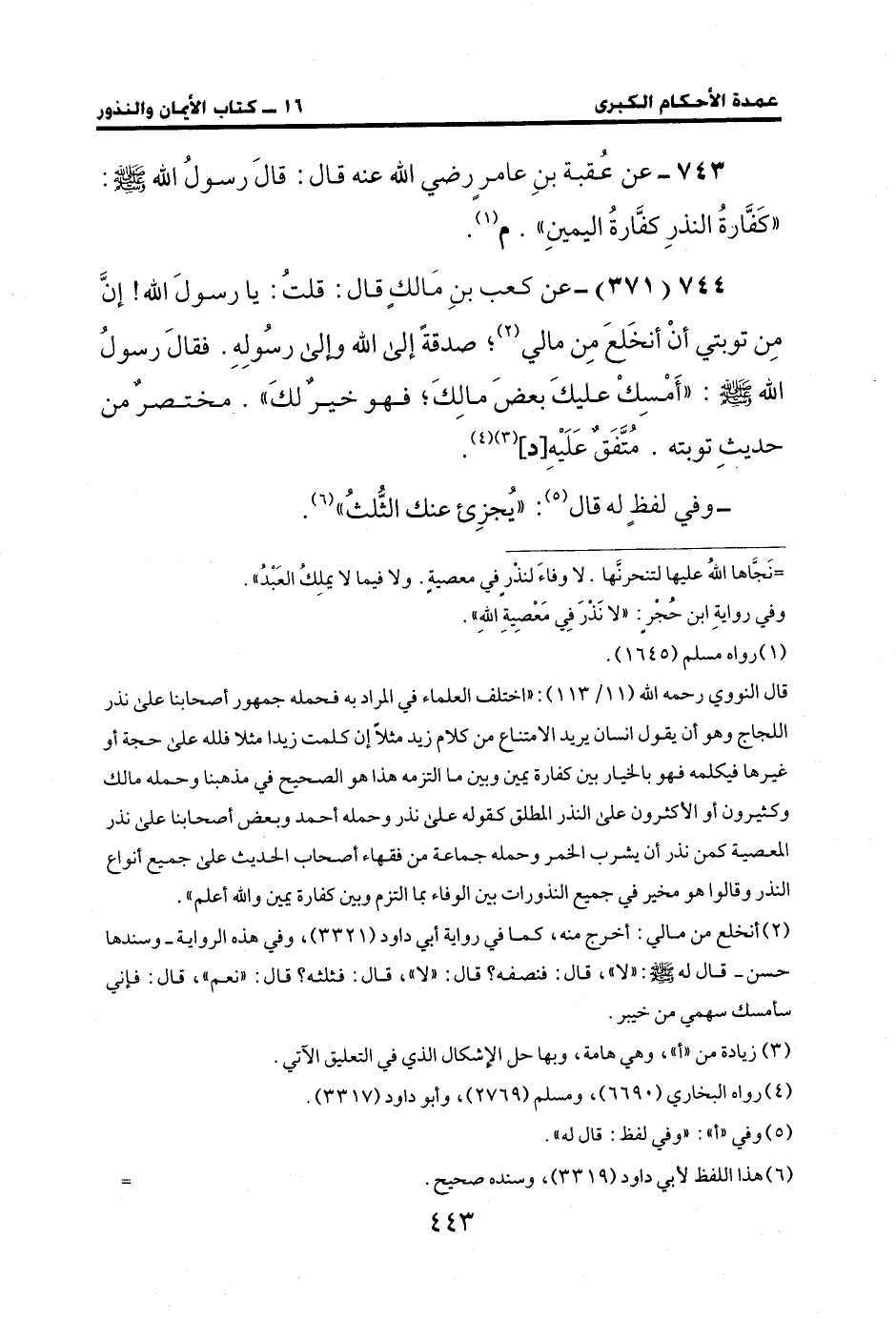743 - عن عقبة بنِ عامر رضي الله عنه قال: قالَ رسولُ الله - صلى الله عليه وسلم -: "كَفَّارة النذرِ كفَّارةُ اليمينِ". م (¬1).